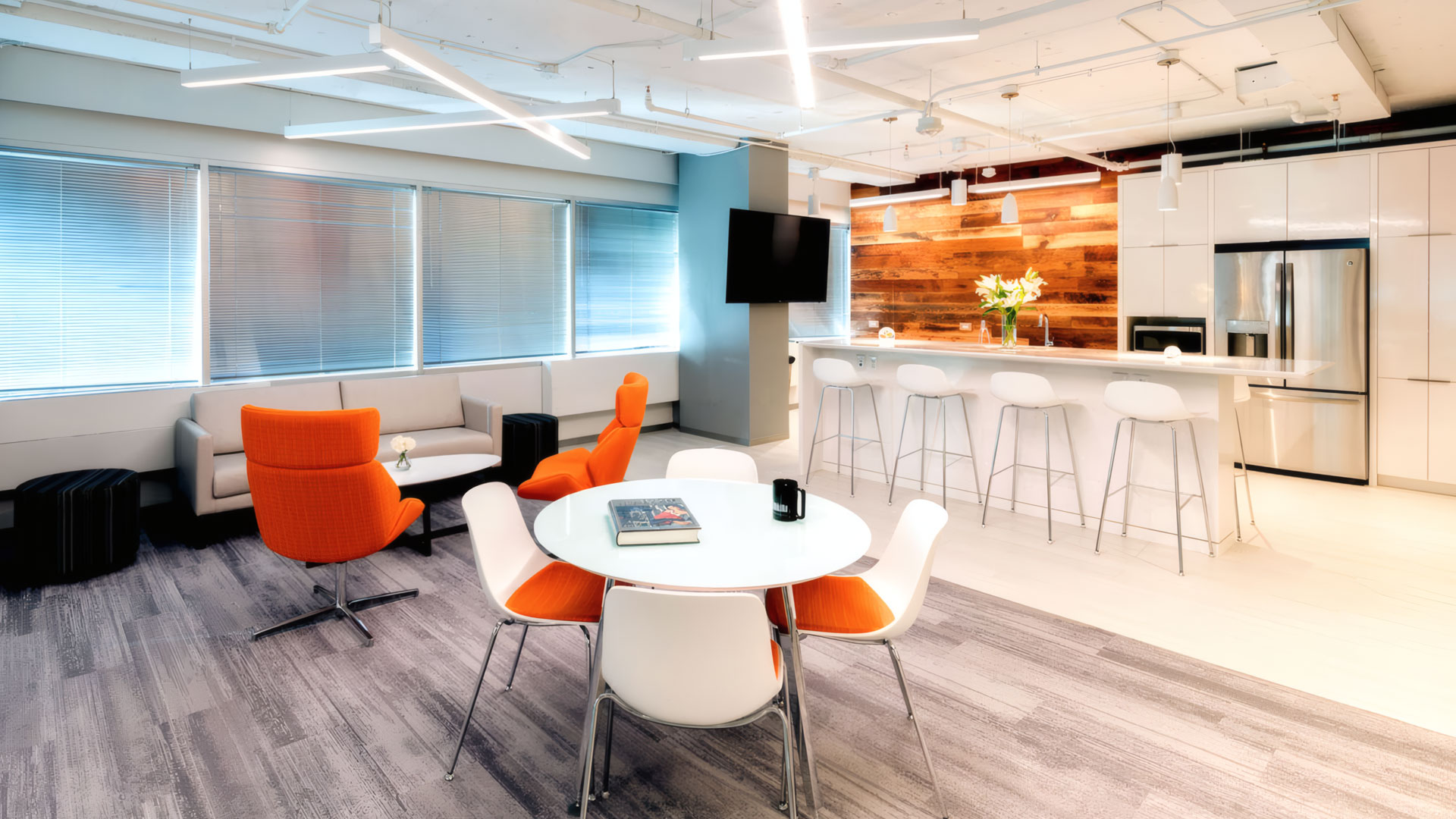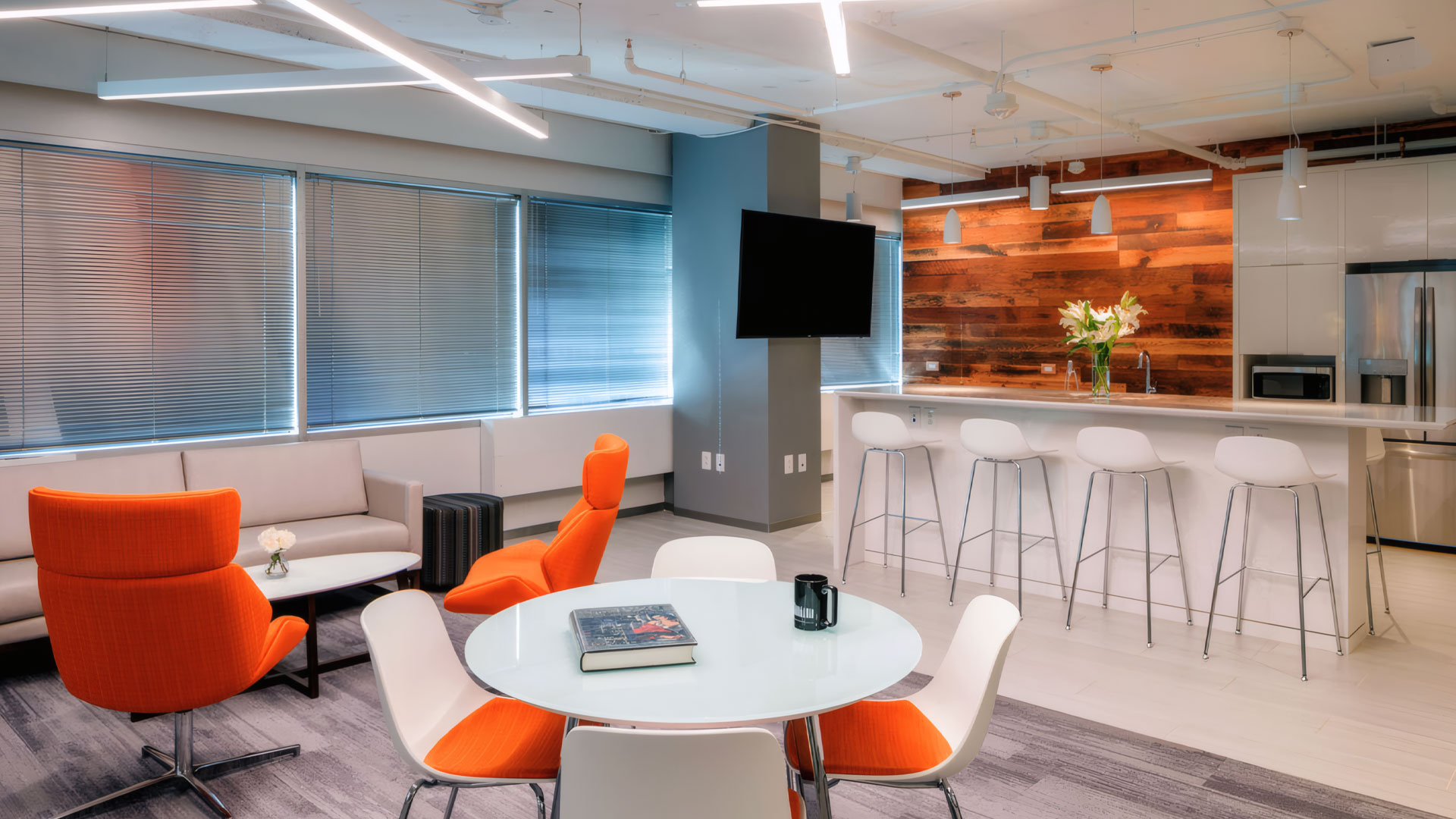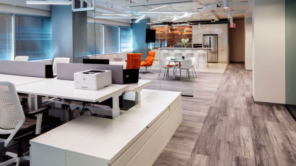 The Excel Group is a hospitality-focused real estate investment and asset management firm. The driving forces behind the office space design were the firm’s corporate culture of openness and transparency, and its focus on innovation. Glass front offices, open ceilings, collaboration spaces, and the open pantry reflect these values. Multidirectional carpet distinguishes work areas from paths of travel, while reclaimed wood softens and accentuates featured spaces.