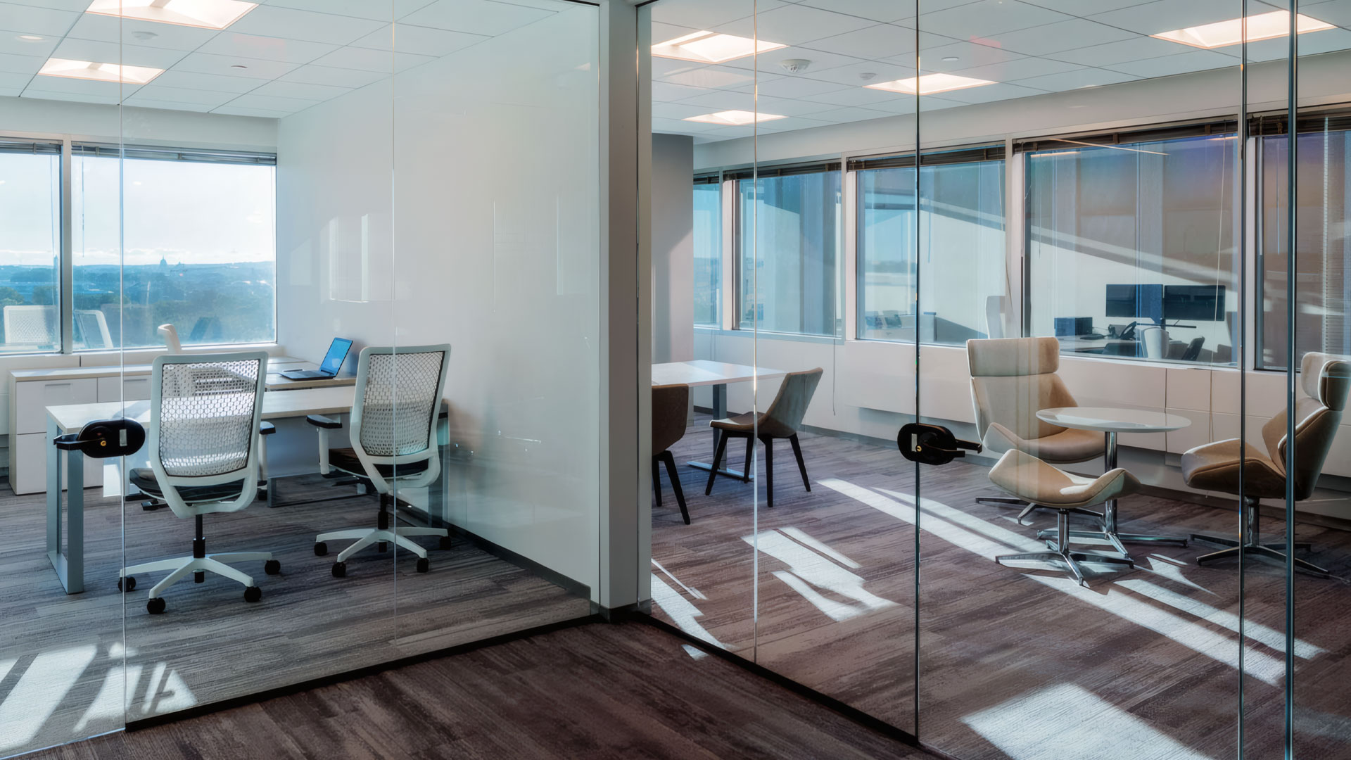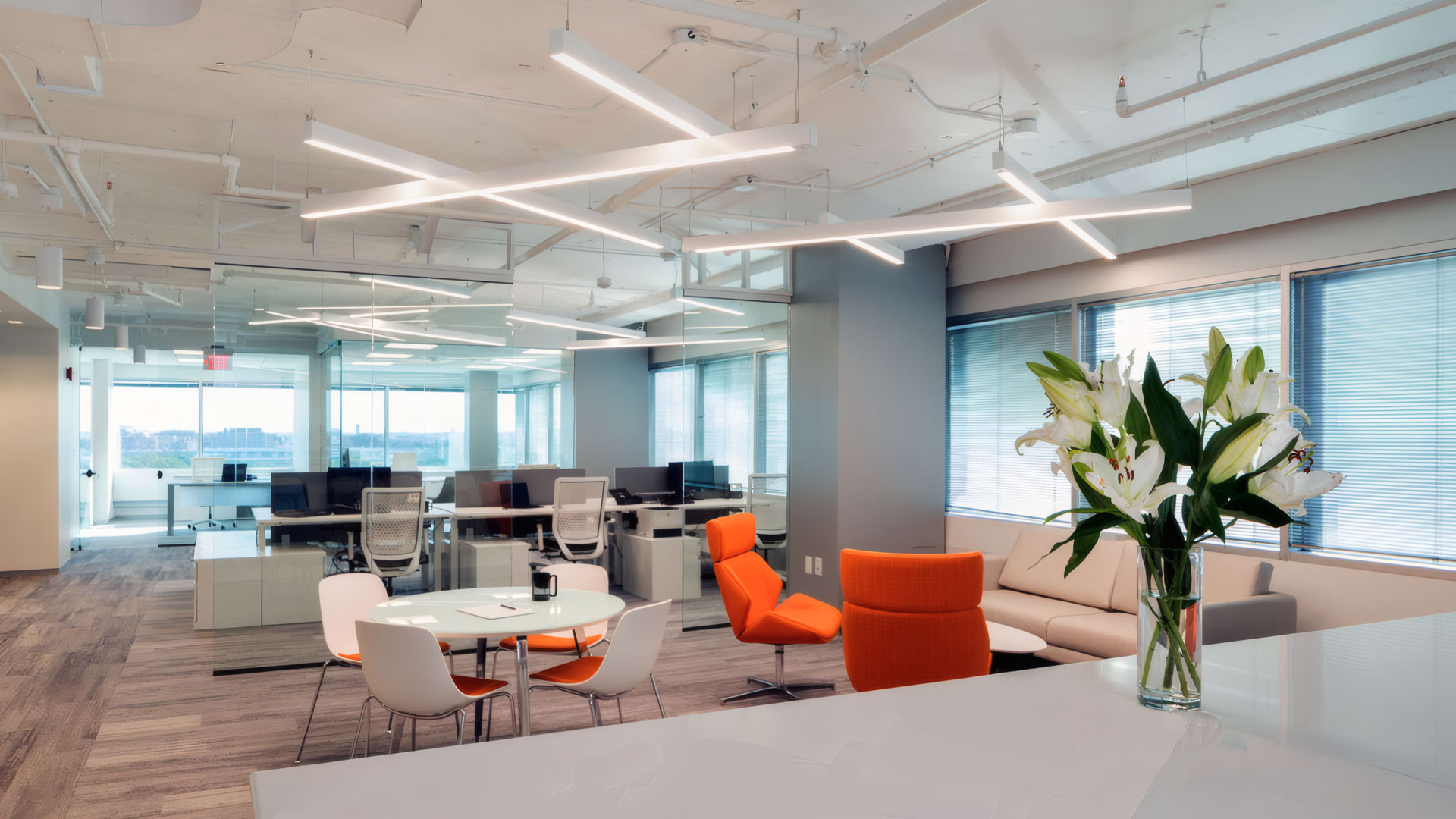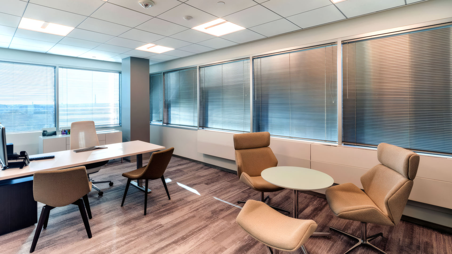 The Excel Group is a hospitality-focused real estate investment and asset management firm. The driving forces behind the office space design were the firm’s corporate culture of openness and transparency, and its focus on innovation. Glass front offices, open ceilings, collaboration spaces, and the open pantry reflect these values. Multidirectional carpet distinguishes work areas from paths of travel, while reclaimed wood softens and accentuates featured spaces.